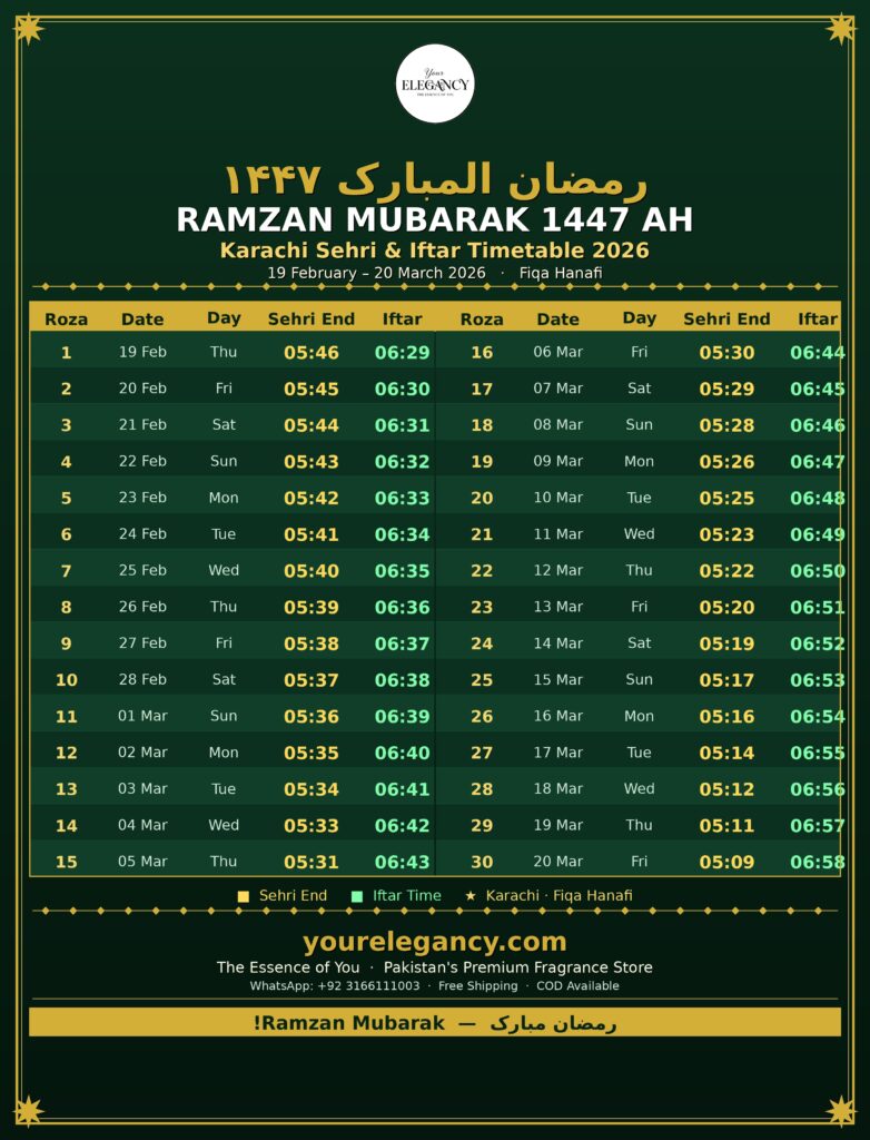 Whether you are at home, at work, or traveling within Karachi, this timetable will help you stay punctual for your fast throughout Ramadan 2026.